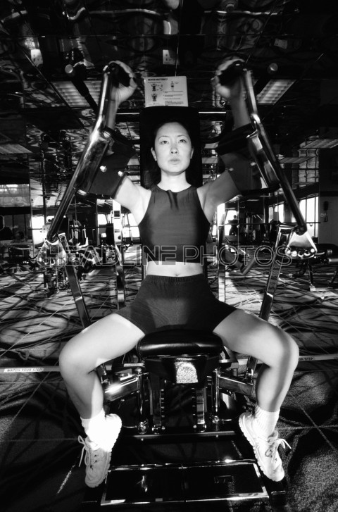 Portrait of one fit young hispanic man flexing his biceps to show big strong muscles from regular exercise in a gym