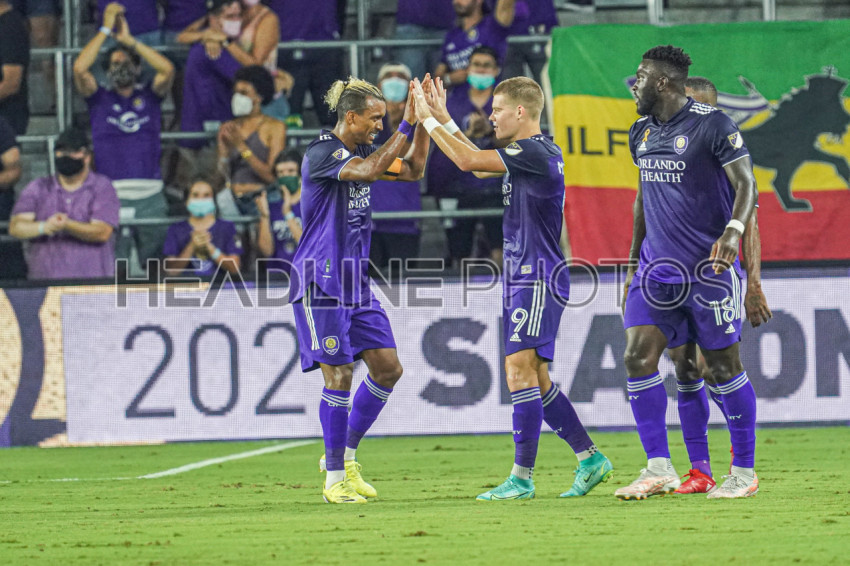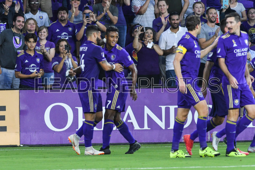Orlando City team Cristian Higuita (the 7)celebrate goal by Dom Dwyer (14) - Orlando City Stadium September 1, 2018