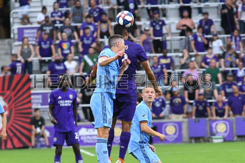 Orlando City's Tesho Akindele (13) wins the header agains NYC FC during the U.S. Open Cup at Exploria Stadium in Orlando, Floria on Wednesday July 10, 2019. Photo Credit: Marty Jean-Louis