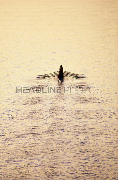 A man rowing a boat on the sparkling Yodo River in the morning sun