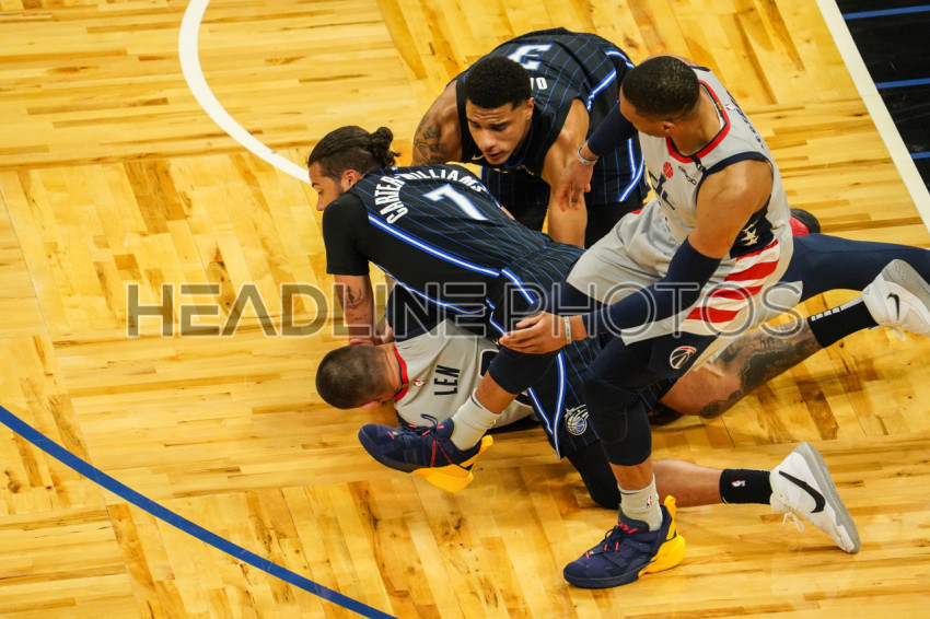 Orlando, Florida, USA, April 7, 2021, Washington Wizards and Orlando Magic players fight for the ball at the Amway Center (Photo Credit: Marty Jean-Louis)