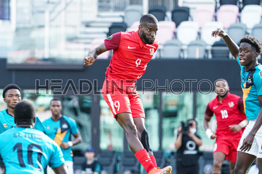 Fort Lauderdale, Florida, USA, July 3, 2021, Guadeloupe Forward Raphael Mirval #9 makes a header and score during the Concacaf Gold Cup Prelims at Drive Pink Stadium. (Photo Credit: Marty Jean-Louis)