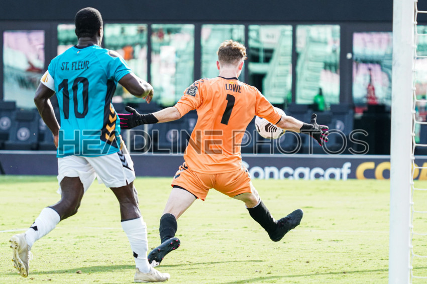 Fort Lauderdale, Florida, USA, July 3, 2021, Bahamas Goalkeeper Ian Lowe #1 blocks a goal attempt during the Concacaf Gold Cup Prelims at Drive Pink Stadium. (Photo Credit: Marty Jean-Louis)