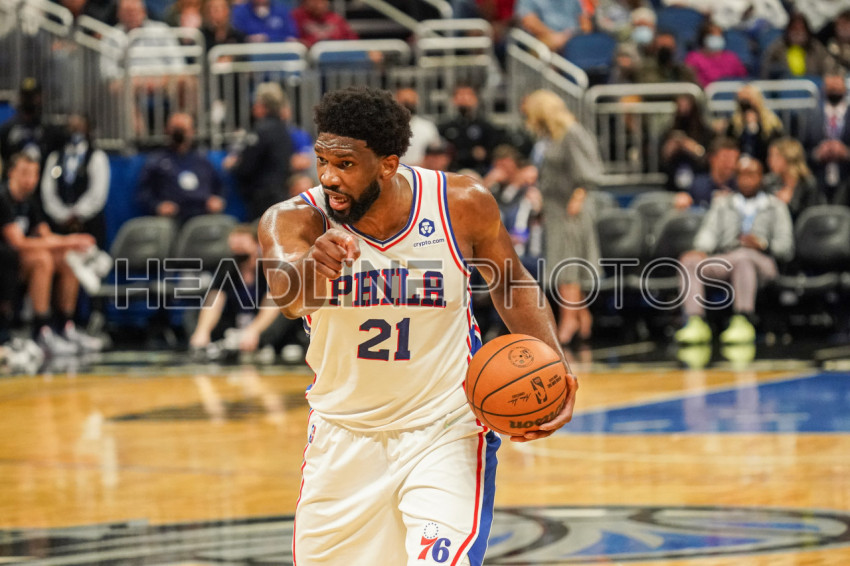 Orlando, Florida, USA, December 30, 2021, Philadelphia 76ers Center Joel Embiid #21 signals his teammate during the first half at the Amway Center. (Photo Credit: Marty Jean-Louis)