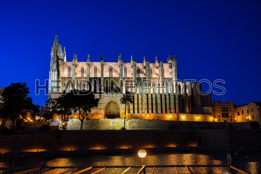 A nighttime view of Palma Church in Palma De Mallorca Spain