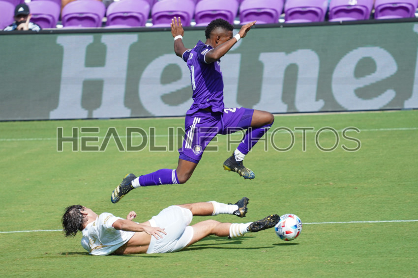 Orlando, Florida, USA, April 17, 2021, Orlando City SC Midfielder Andrйs Perea #21 leaps to avoid tackle at Exploria Stadium in Orlando Florida, USA (Photo Credit: Marty Jean-Louis)
