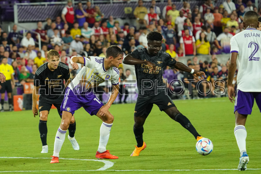 Orlando, Florida, USA, July 20, 2022, Arsenal FC Winger Bukayo Saka #7 attempt to score against Orlando City at Exploria Stadium in a Friendly Match. (Photo Credit: Marty Jean-Louis)
