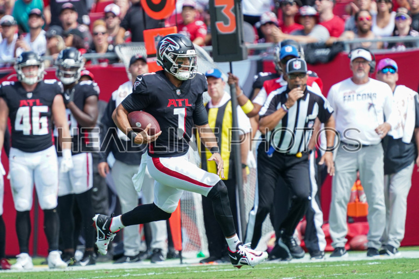 Tampa Bay, Florida, USA, October 9, 2022, Atlanta Falcons Quaterback Marcus Mariota #1 makes a run during the game at Raymond James Stadium. (Photo Credit: Marty Jean-Louis)