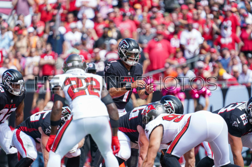 Tampa Bay, Florida, USA, October 9, 2022, Atlanta Falcons Quaterback Marcus Mariota #1 readies to receive the ball during the game at Raymond James Stadium. (Photo Credit: Marty Jean-Louis)