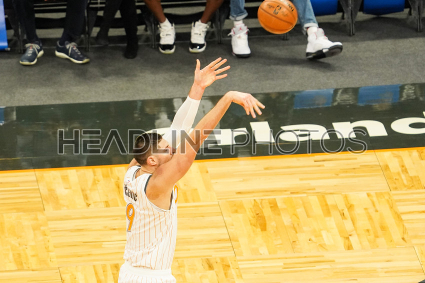 Orlando, Florida, USA, February 5, 2021, Orlando Magic player NIkola Vucevic #9 shoots a three point during the game against the Chicago Bulls at the Amway Center (Photo Credit: Marty Jean-Louis)