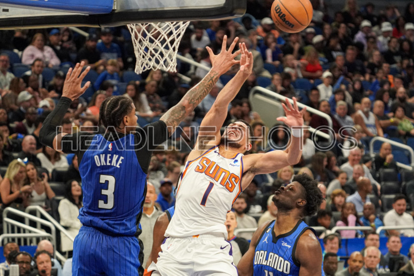 Orlando, Florida, USA, November 7, 2022, Phoenix Suns face guard Devin Booker #1 attempt to make a basket but is blocked by Chuma Okeke #3 in the second half at the Amway Center. (Photo Credit: Marty Jean-Louis)