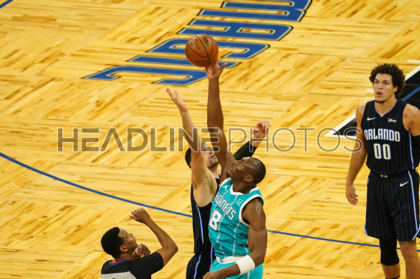 Orlando, Florida, USA, January 25, 2021, Charlotte Hornets player Bismack Biyombo #8 and Orlando Magic Player Nikola Vucevic #9 jump for the tipoff at the Amway Center (Photo Credit: Marty Jean-Louis)
