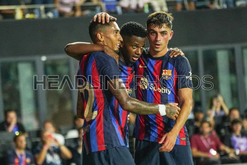 Fort Lauderdale, Florida, USA, July 19, 2022, FC Barcelona players Raphinha #22, Ansu Fati #10 and Andreas Christensen celebrate after scoring against Inter Miami at DRV PNK Stadium in a Friendly Match. (Photo Credit: Marty Jean-Louis)