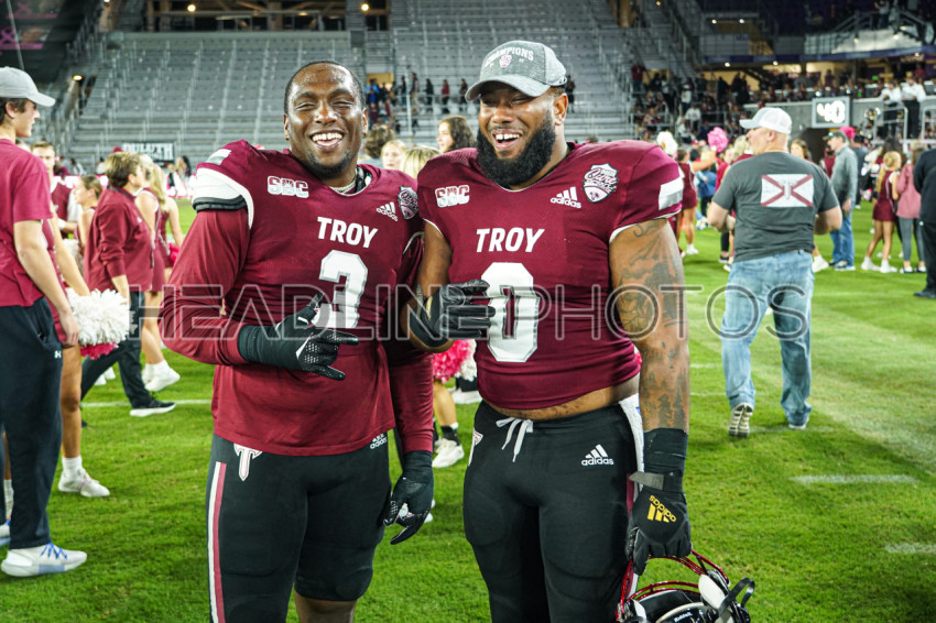 Orlando, Florida, USA, December 16, 2022, Troy Trojans players Peter Costelli #3 and JRaJae' Johnson #0 smiles after winning the Duluth CureBowl at Exploria Stadium. (Photo Credit: Marty Jean-Louis)