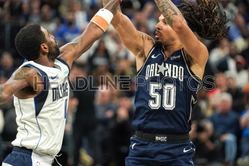 Orlando, Florida, USA, November 6, 2023, Orlando Magic guard Cole Anthony #50 attempt to make a three as Kyrie Irving attempt to block at the Amway Center. (Photo Credit: Marty Jean-Louis)