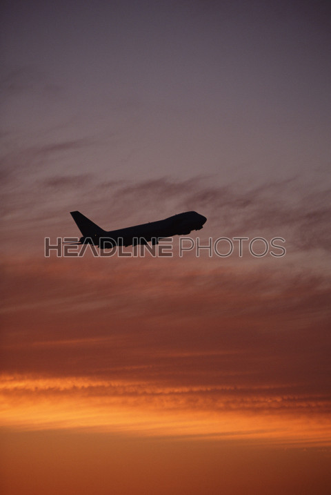 The silhouette of a passenger plane flying in sunset