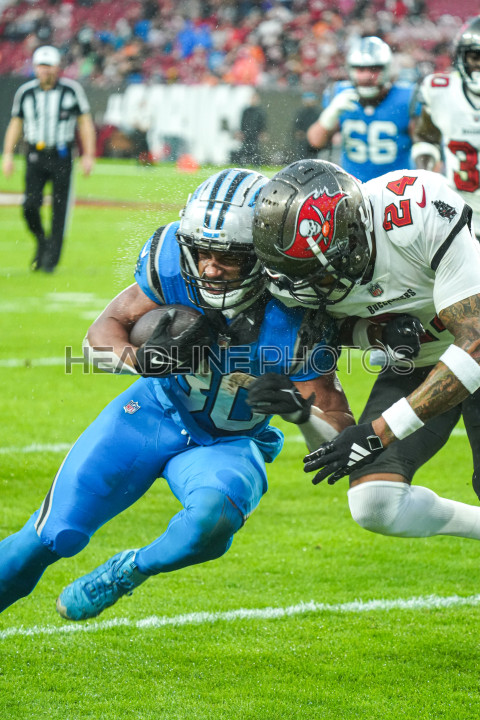 Tampa Bay, Florida, USA, December 3, 2023, Carolina Panthers runningback Chuba Hubbard #30 gets hit by Carton Davis III #24 at Raymond James Stadium. (Photo Credit: Marty Jean-Louis)