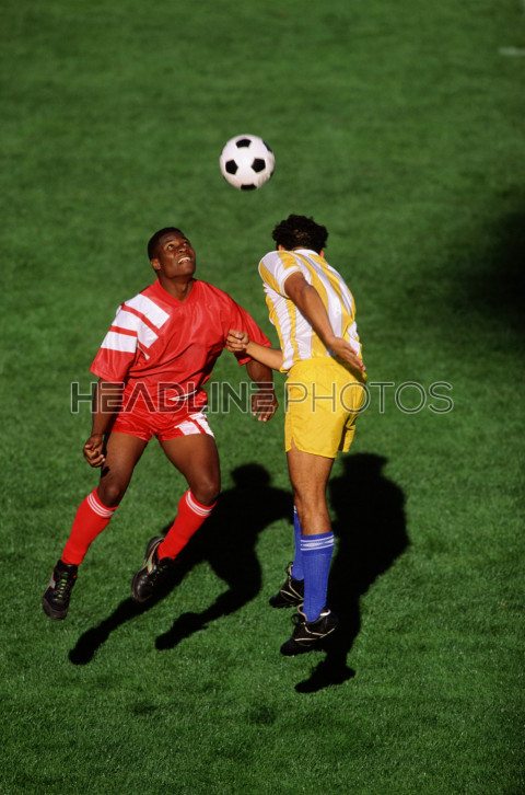 Two football men running ball in a duel