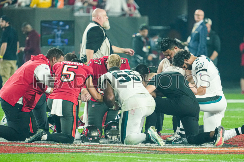 Tampa Bay, Florida, USA, January 15, 2024, Philadelphia Eagles and Tampa Bay Buccaneers players kneeling together to pray after the game ended at Raymond James Stadium. (Photo Credit: Marty Jean-Louis)