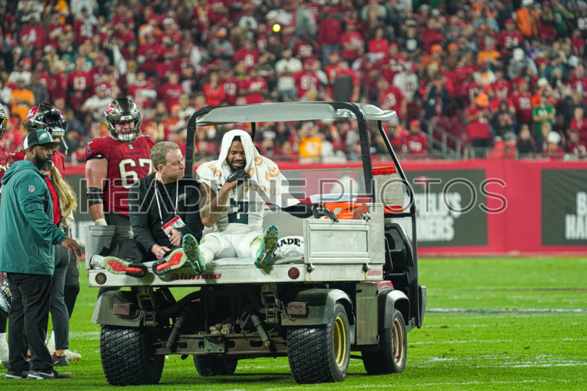 Tampa Bay, Florida, USA, January 15, 2024, Philadelphia Eagles player Darius Slay #2 is being escorted out of the field by the medical staff at Raymond James Stadium. (Photo Credit: Marty Jean-Louis)