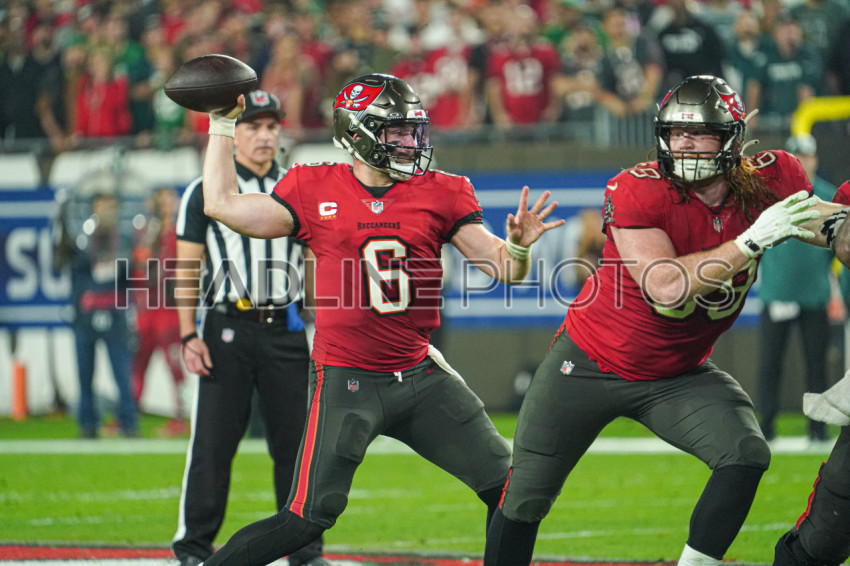 Tampa Bay, Florida, USA, January 15, 2024, Tampa Bay Buccaneers quarterback Baker Mayfield #6 makes a pass at Raymond James Stadium. (Photo Credit: Marty Jean-Louis)