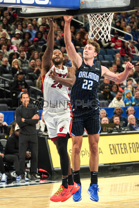 Orlando, Florida, USA, January 31, 2024, Miami Heat forward Kaywood Highsmith #24 attempt to score as Franz Wagner #22 attempt to block at the Kia Center. (Photo Credit: Marty Jean-Louis)