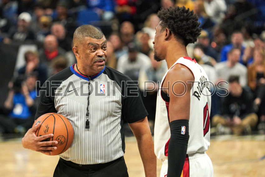 Orlando, Florida, USA, January 31, 2024, NBA Official talks to Miami Heat guard Josh Richardson #0 at the Kia Center. (Photo Credit: Marty Jean-Louis)