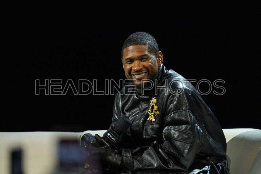 Las Vegas Nevada, USA, February 8, 2024, R&B Artist Usher speaking during the 2024 Apple Music Super Bowl Halftime Show Press Conference at the Mandalay Bay Resort (Photo Credit: Marty Jean-Louis)