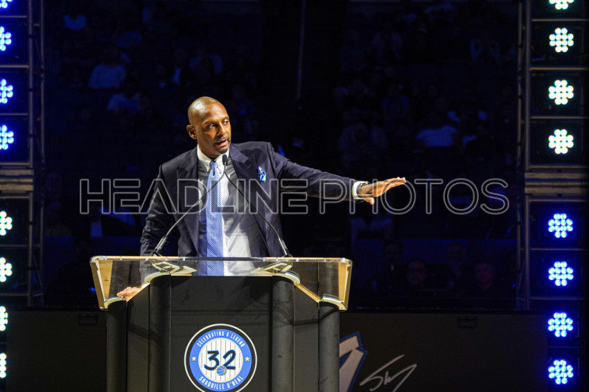 Orlando, Florida, USA, February 13, 2024, Penny Hardaway speaks During the Shaquille O'Neal Jersey Retirement Ceremony at the Kia Center. (Photo Credit: Marty Jean-Louis)