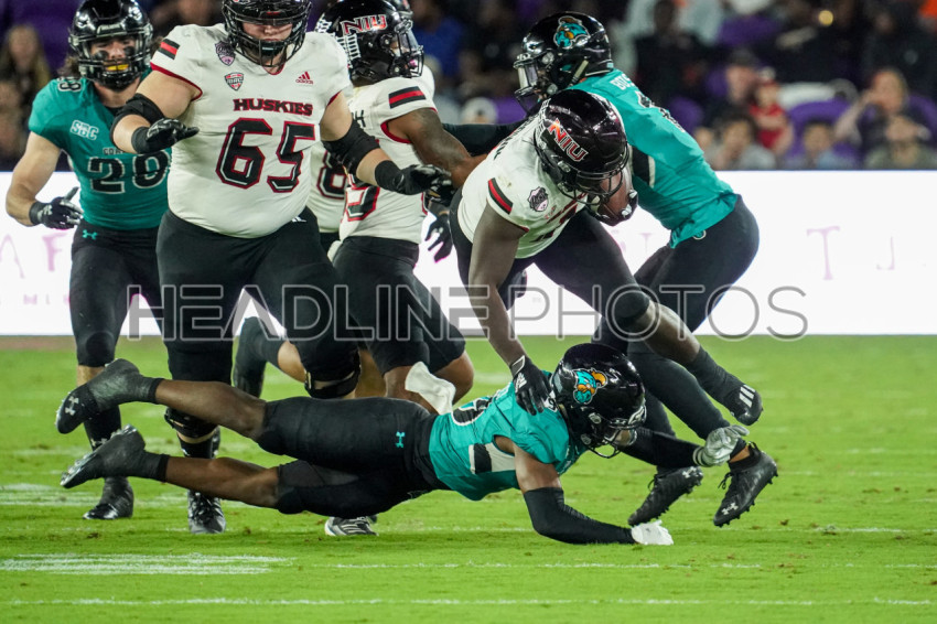 Orlando, Florida, USA, December 15, 2021, NIU Huskies player Antario Brown #1 gets tackled during the 7th Annual Tailgreeter Cure Bowl at Exploria Stadium (Photo Credit: Marty Jean-Louis)