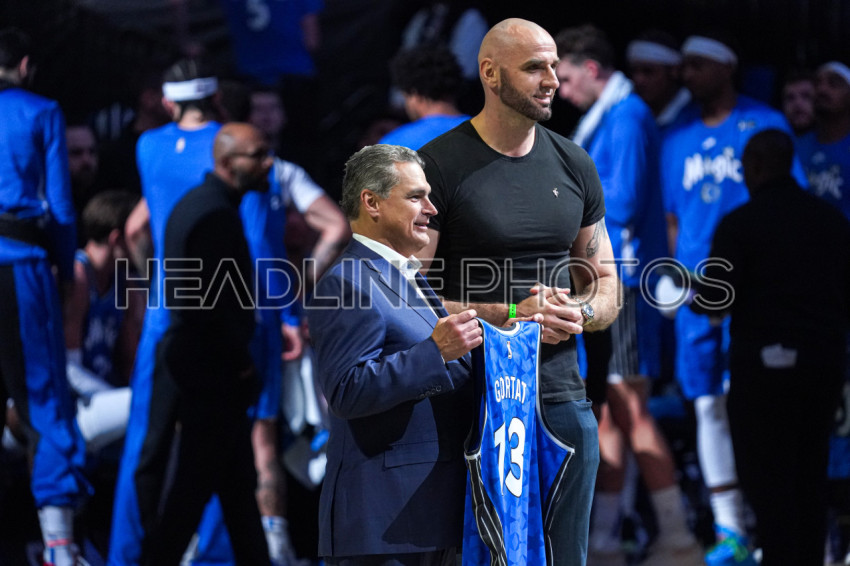 Orlando, Florida, USA, March 29, 2024, Former Orlando Magic player Marcin Gortat receives special Jersey at the Kia Center. (Photo Credit: Marty Jean-Louis)