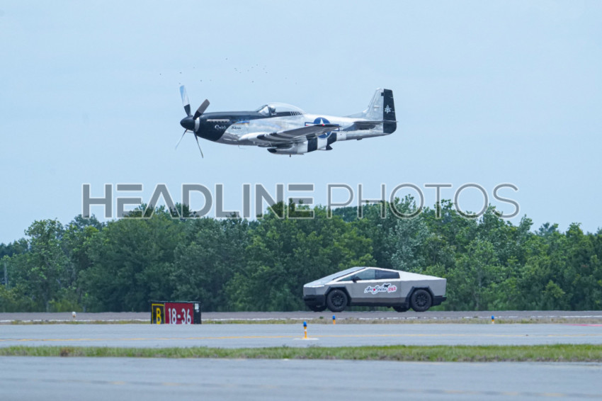 Sanford, Florida, USA, April 21, 2024, P-51 Mustang racing the Cyber truck During the 2024 Orlando Air Show at the Orlando, Sanford International Airport. (Photo Credit: Marty Jean-Louis)