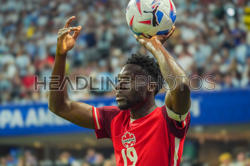 Atlanta, Georgia, USA, June 20, 2024, Canada player Alphonso Davies #19 makes a throw during the 2024 Copa America at Mercedes-Benz Stadium. (Photo Credit: Marty Jean-Louis)