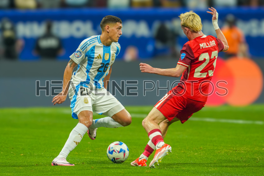 Atlanta, Georgia, USA, June 20, 2024, Argentina's Nahuel Molina #26 moves across the fied as Liam Millar #23 approaches during the 2024 Copa America at Mercedes-Benz Stadium. (Photo Credit: Marty Jean-Louis)