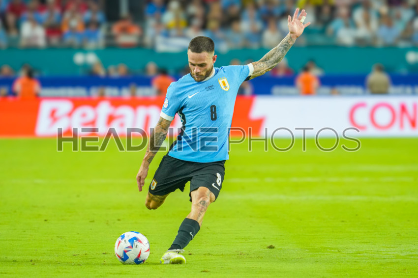 Miami Gardens, Florida, USA, June 20, 2024, Uruguay player Nahitan Nández #8 attempt to score during the 2024 Copa America at the Hard Rock Stadium. (Photo Credit: Marty Jean-Louis)