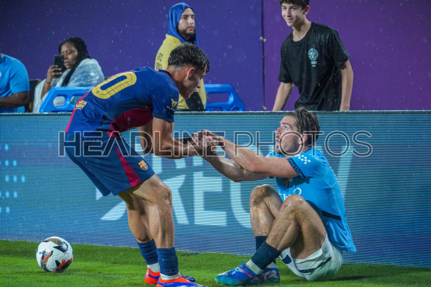 Orlando, Florida, USA, July 30, 2024, FC Barcelona player Héctor Fort 320 pulling up Manchester City FC player Jack Grealish #10 during the 2024 FC Series at Camping World Stadium. (Photo Credit: Marty Jean-Louis)