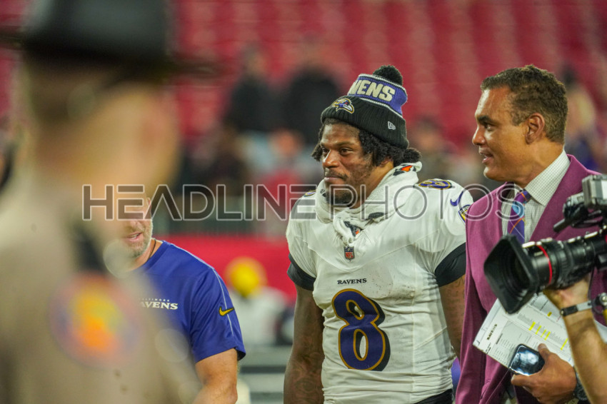 Tampa Bay, Florida, USA, October 21, 2024, Baltimore Ravens quarterback Lamar Jackson #8 leaves the field after a win at Raymond James Stadium. (Photo Credit: Marty Jean-Louis)