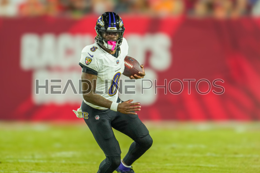 Tampa Bay, Florida, USA, October 21, 2024, Baltimore Ravens quarterback Lamar Jackson #8 makes a run at Raymond James Stadium. (Photo Credit: Marty Jean-Louis)