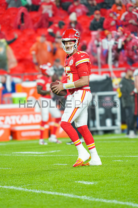 Kansas City, Missouri, USA, November 4, 2024, Kansas City Chiefs quarterback Patrick Mahomes #15 warming up at GEHA Field Arrowhead Stadium. (Photo Credit: Marty Jean-Louis)