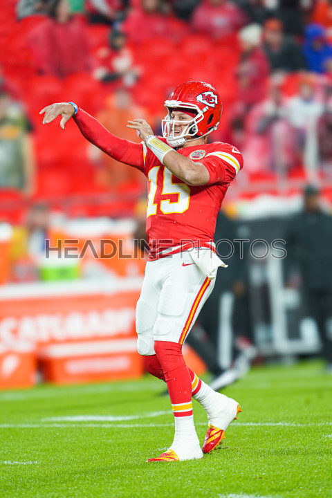 Kansas City, Missouri, USA, November 4, 2024, Kansas City Chiefs quarterback Patrick Mahomes #15 warming up at GEHA Field Arrowhead Stadium. (Photo Credit: Marty Jean-Louis)