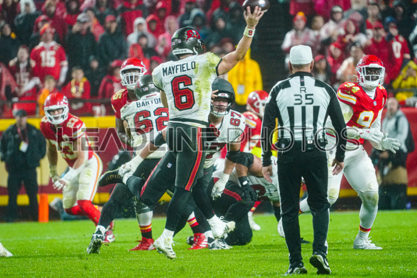 Kansas City, Missouri, USA, November 4, 2024, Tampa Bay Buccaneers quarterback Baker Mayfield #6 makes a pass at GEHA Field Arrowhead Stadium. (Photo Credit: Marty Jean-Louis)
