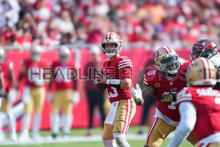 Tampa Bay, Florida, USA, November 10, 2024, San Francisco 49ers quarterback Brock Purdy #13 makes a pass at Raymond James Stadium. (Photo Credit: Marty Jean-Louis)