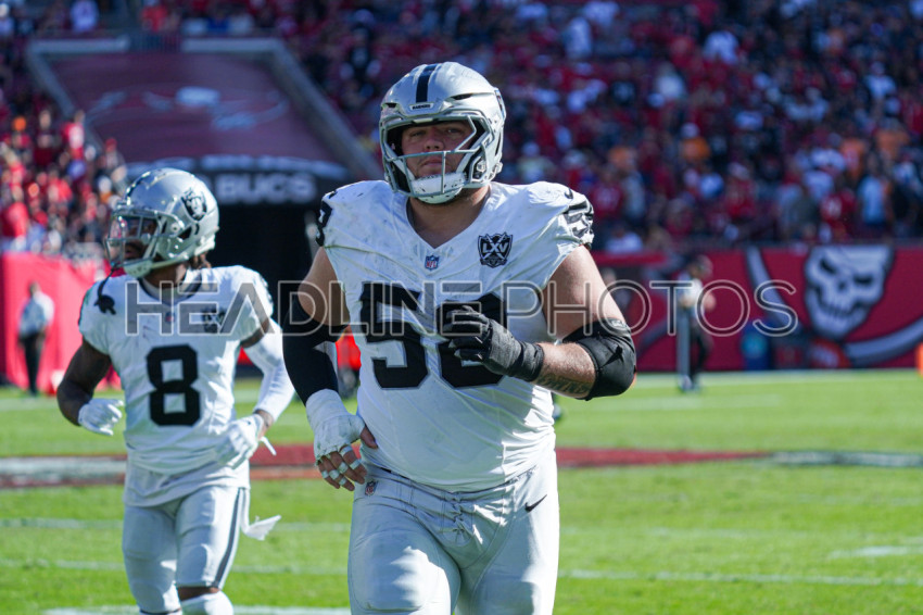 Tampa Bay, Florida, USA, December 8, 2024, Las Vegas Raiders player Jackson Powers-Johnson #58 at Raymond James Stadium. (Photo Credit: Marty Jean-Louis)