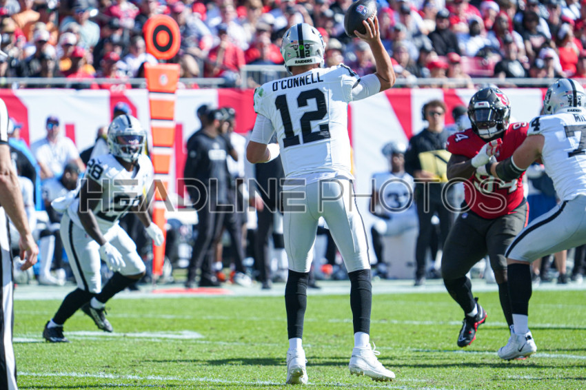 Tampa Bay, Florida, USA, December 8, 2024, Las Vegas Raiders quarterback Aidan O'Connel #12 makes a pass at Raymond James Stadium. (Photo Credit: Marty Jean-Louis)