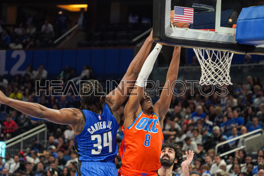 Orlando, Florida, USA, December 19, 2024, Oklahoma Thunder forward Jalen Williams #8 attempt to make a dunk but is fouled by Wendell Carter Jr #34 at the Kia Center. (Photo Credit: Marty Jean-Louis)