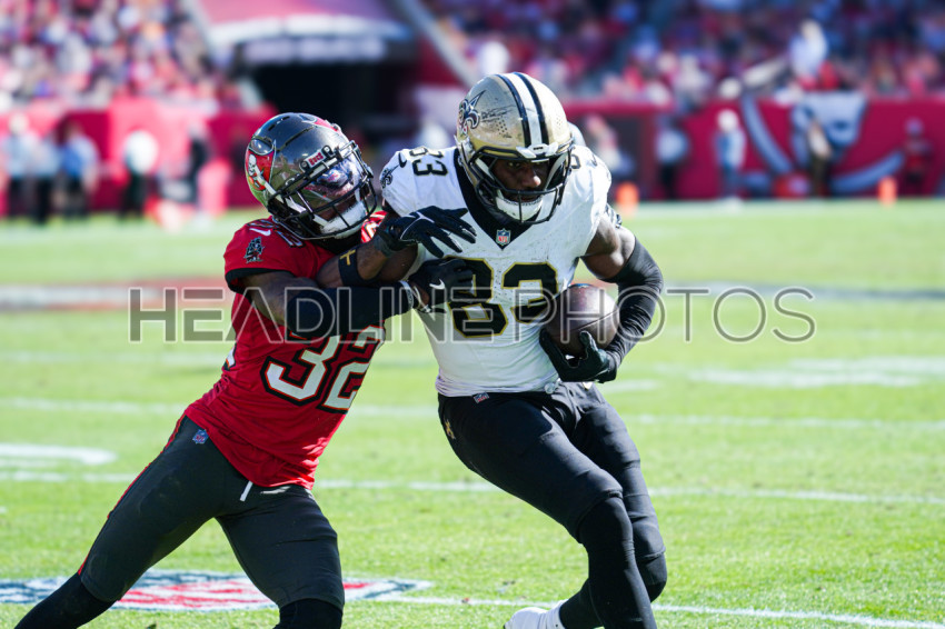 Tampa Bay, Florida, USA, January 5, 2025, New Orleans Saints tight end Juwan Johnson #83 is pushed by Josh Hayes #32 at Raymond James Stadium. (Photo Credit: Marty Jean-Louis)