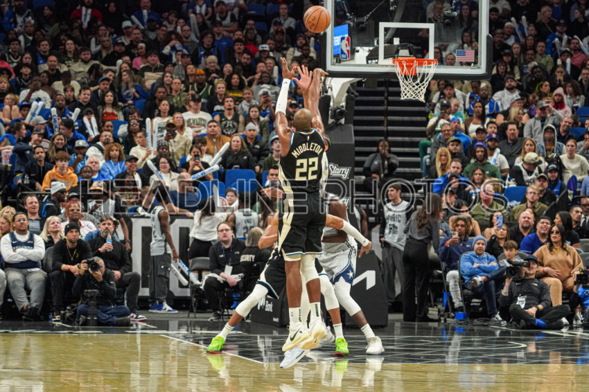 Orlando, Florida, USA, January 10, 2025, Milwaukee Bucks forward Khris Middleton #22 shoots a three at the Kia Center. (Photo Credit: Marty Jean-Louis)