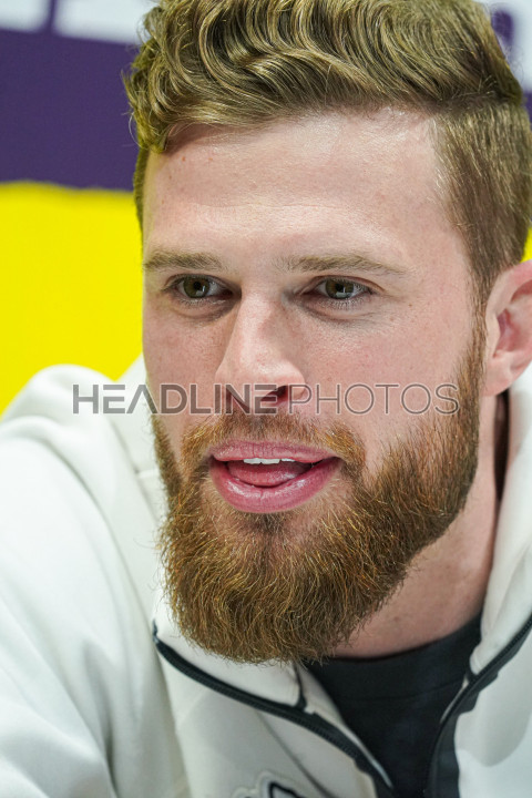 Chiefs player Harrison Butker answering questions from reporters During the Super Bowl LIX (59) Opening Night Ceremony at the Caesars Superdome in New Orleans, Louisiana