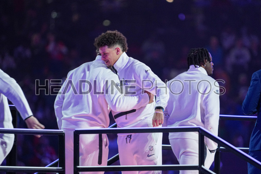 Quarterbacks Jalen Hurts (left) and Patrick Mahomes sharing a hug During the Super Bowl LIX (59) Opening Night Ceremony at the Caesars Superdome in New Orleans, Louisiana
