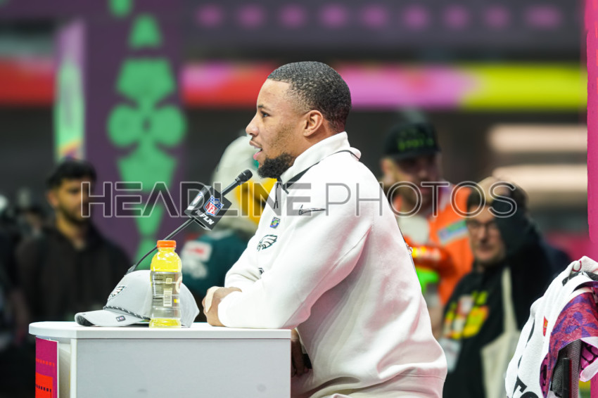 Eagles running back Saquan Barkley answering questions from reporters During the Super Bowl LIX (59) Opening Night Ceremony at the Caesars Superdome in New Orleans, Louisiana